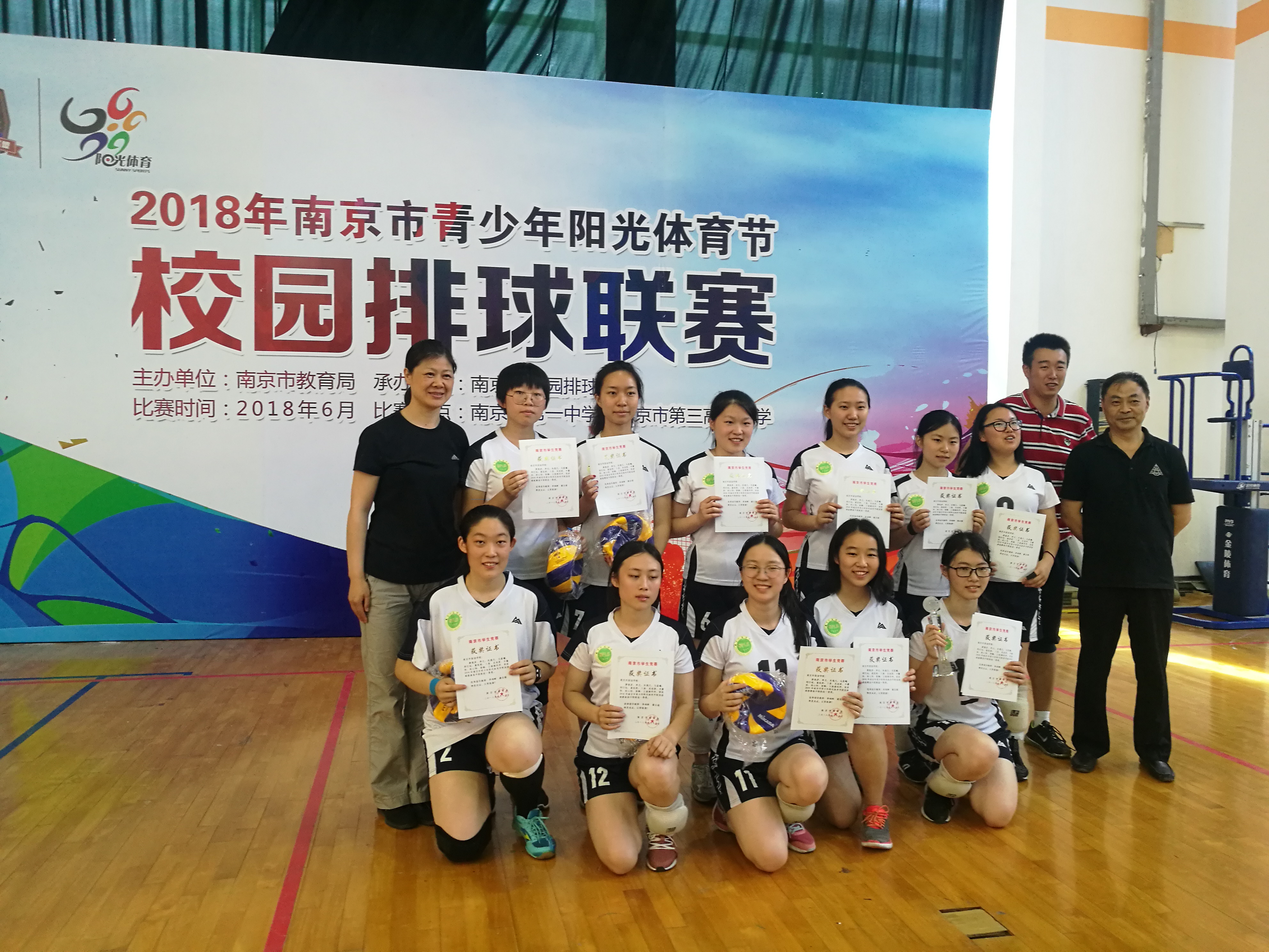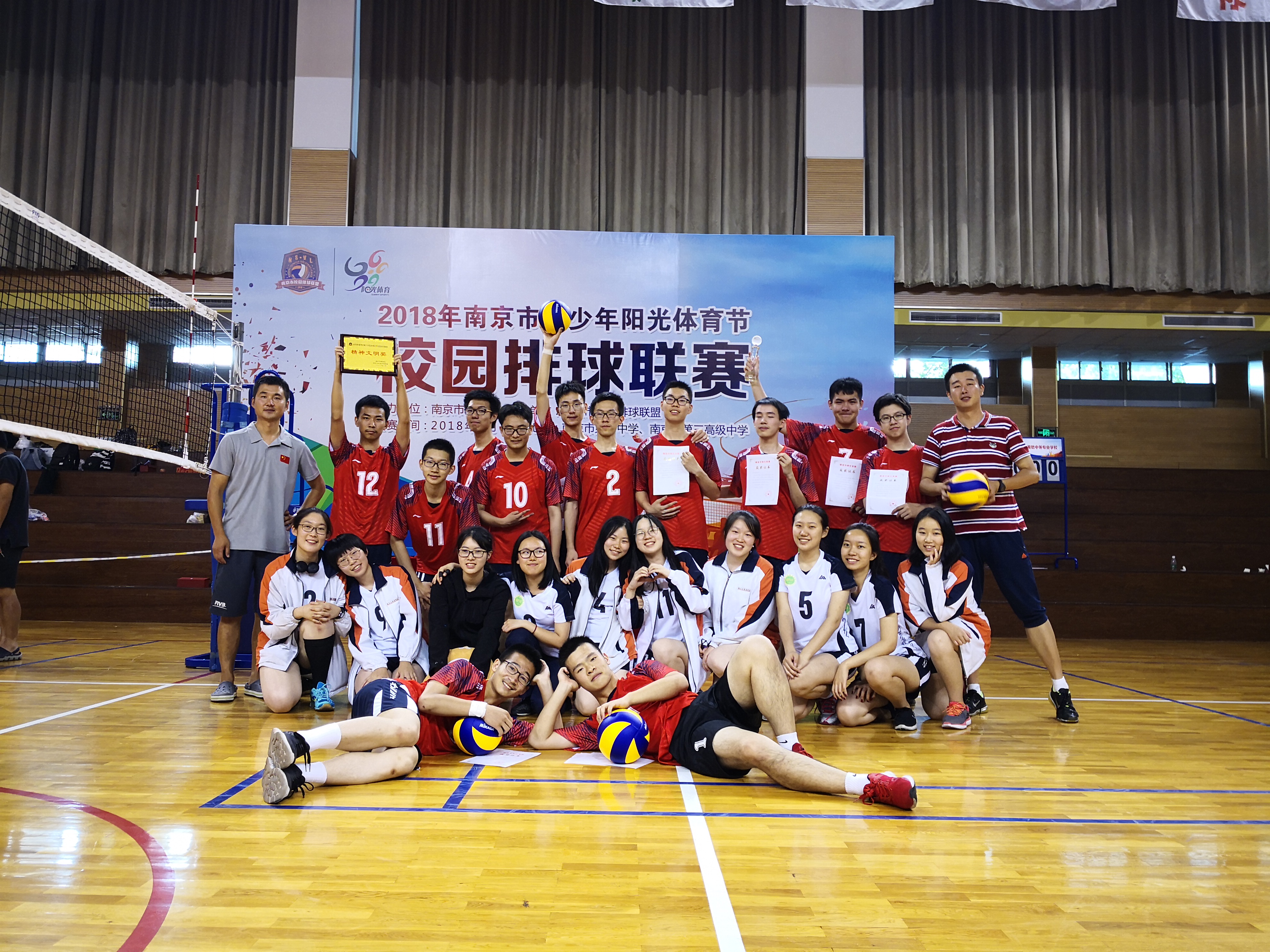 2018年南京市青少年阳光体育节校园排球联赛高中职校男子、女子组的比赛于2018年6月16日在南京一中和南京三中落下帷幕,我校高中男、女排在比赛中奋勇拼搏,遵守比赛规则,尊重裁判与对手,赛出了风格,打出了水平,最终都荣获一等奖,同时荣获“精神文明奖”。