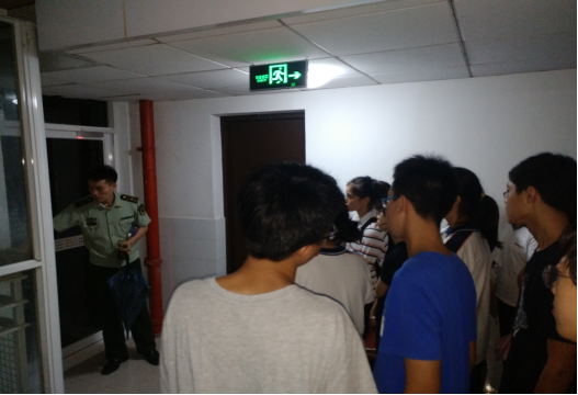 对消防知识的讲座仅仅是这次消防演习的一部分,夏参谋还来到了我们宿舍楼,向我们介绍学生宿舍消防通道、通道门的位置和应急照明灯的用法,并告诉我们遇到火灾时要沿着墙走等要点。宿舍楼在暑假时修建了一个新的消防楼梯。夏参谋打开了这个楼梯的一个消防按钮,演示了平时关闭消防门是如何在按钮被按下后断电并打开的。我们虽然之前很早就知道那些按钮有消防的作用,但看到实际操作还是第一次。有了这次经历,如果以后真的遇到了什么紧急情况,在应对的时候也可以更加沉着了。