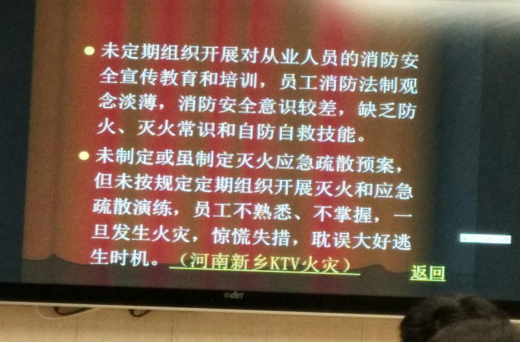接下来就是夏参谋开始正式的讲座了。夏参谋非常用心地准备了图文并茂的幻灯片,给我们看了好几个真实的重大火灾案例,每一个案例都向我们播放了相关新闻报道。在看完视频后,夏参谋还清楚地向我们阐述火灾产生的原因,为什么会造成人员伤亡,是疏散不当还是人们不清楚自救方法等。看了这些案例,我了解到一点小小的火星就能引发一场导致几十人甚至上百人丧生的巨大火灾,不禁心想灾难真的常常是出于疏忽而酿就大祸。加强安全意识是十分重要的。