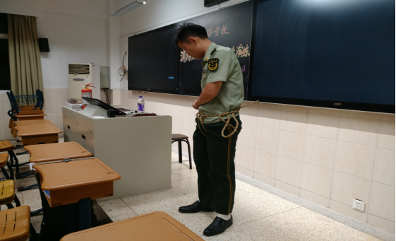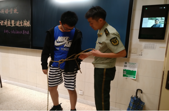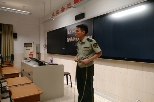 光有概念,没有实际操作怎么行?夏参谋不仅向我们展示了灭火器的用法,还准备了一条逃生绳,向我们演示在逃生的时候应该如何用绳子从窗户逃生。他先演示了一遍打结方法:先是“左压右,右压左”,即左边的绳子先压在右边的绳子上面打个结,接着右边的绳子同理;然后是把绳子从腿下绕到腰旁,从两边把绳子穿过来打个活扣,最后再在身体前方系上。