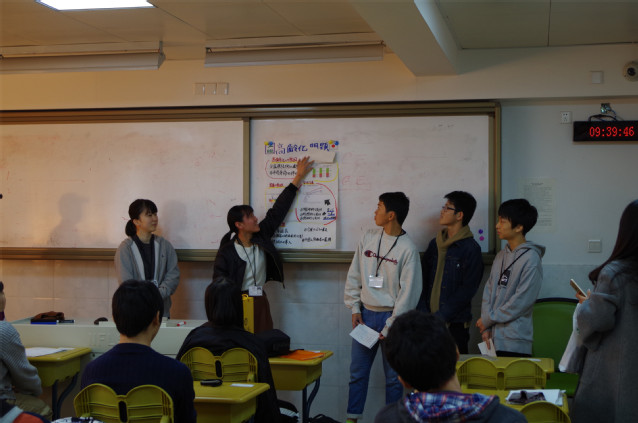 然后,大家分成六组分别针对高龄化社会、劳动方式、环境问题等方面展开了交流。日方学生精心制作的海报,中方学生精美的PPT,都受到了双方老师的高度赞扬。