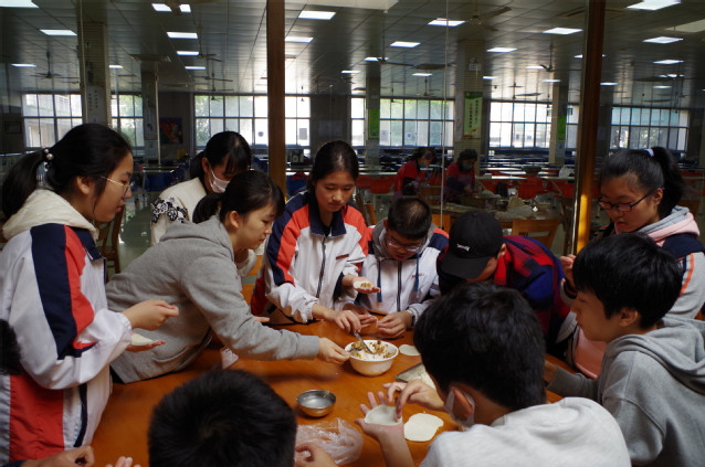 很快到了午饭时间,同学们纷纷带领日本同学包起了饺子。出乎意料,日本同学们包的饺子相当不错,大家一边包饺子一边交流讨论……一阵阵欢声笑语中,热气腾腾的饺子出炉了,南外的食堂洋溢着欢乐祥和的气氛。