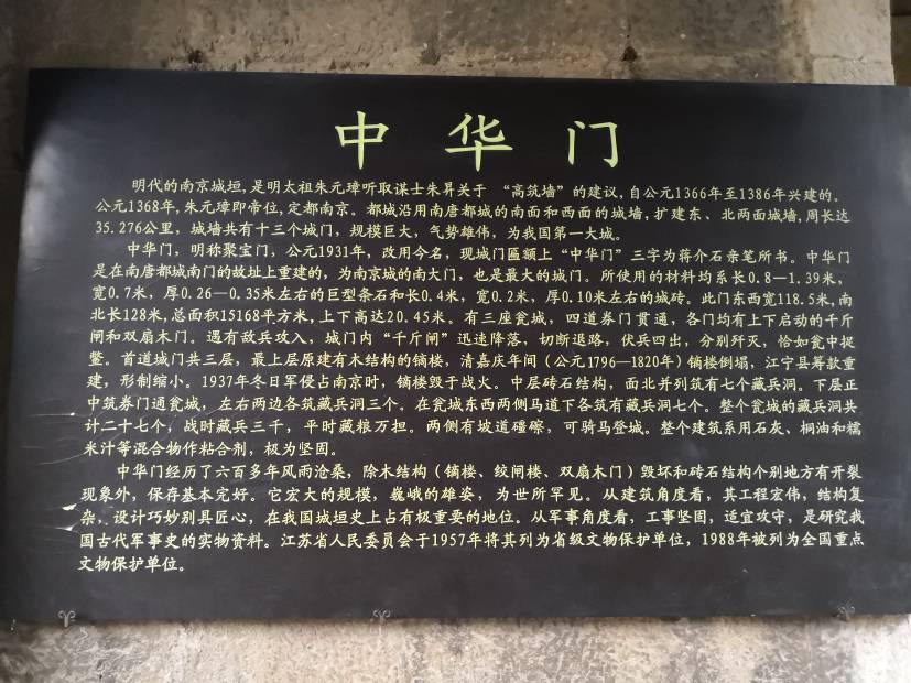 中华门是南京明城墙的十三座明代京城城门之一,原名聚宝门,是中国现存规模最大的城门,也是世界上保存最完好、结构最复杂的堡垒瓮城,其建筑规模仅次于通济门(现已不存),有“天下第一瓮城”之称。中华门布局严整、构造独特,是研究中国古代军事设施的重要实物资料,不论是在军事上、历史上、还是在文化上、城建史上,都占有重要的地位。