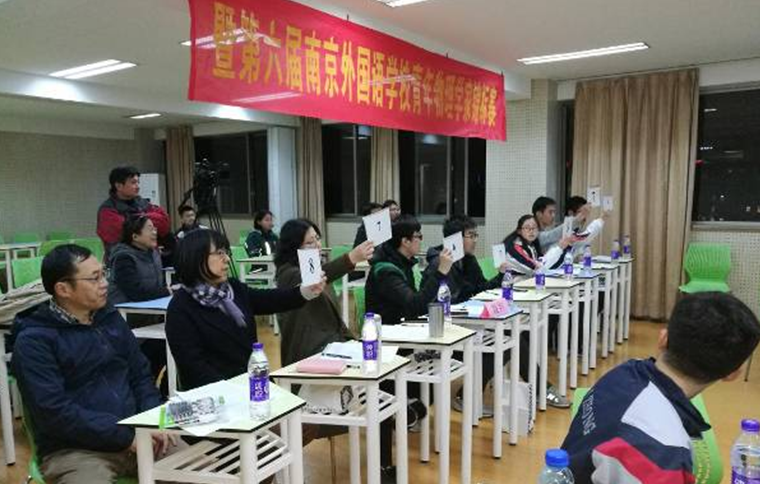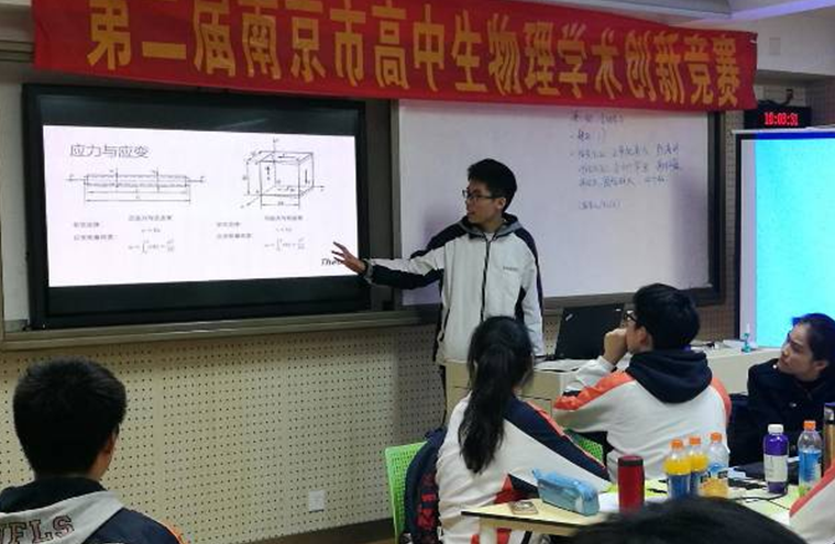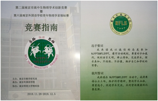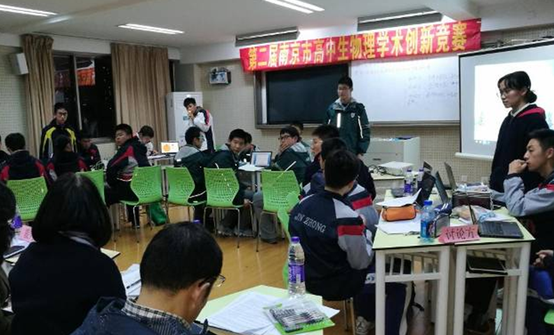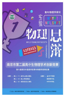 在科技节的浪潮中,由南京市教研室主办、南京外国语学校承办、南师大物科院协办的第二届南京市高中生物理学术创新竞赛(NJYPT-2)暨第六届南京外国语学校青年物理学家锦标赛(NFLSYPT-6)于南京外国语学校综合楼举行。九支参赛代表队分别来自南外本部高中、南外国际部、南师大附中、金陵中学和中华中学。比赛分预、决赛两个轮次,期间参赛选手们进行了友好的交流,分别展示了他们对于IYPT2019部分赛题的研究与实验。