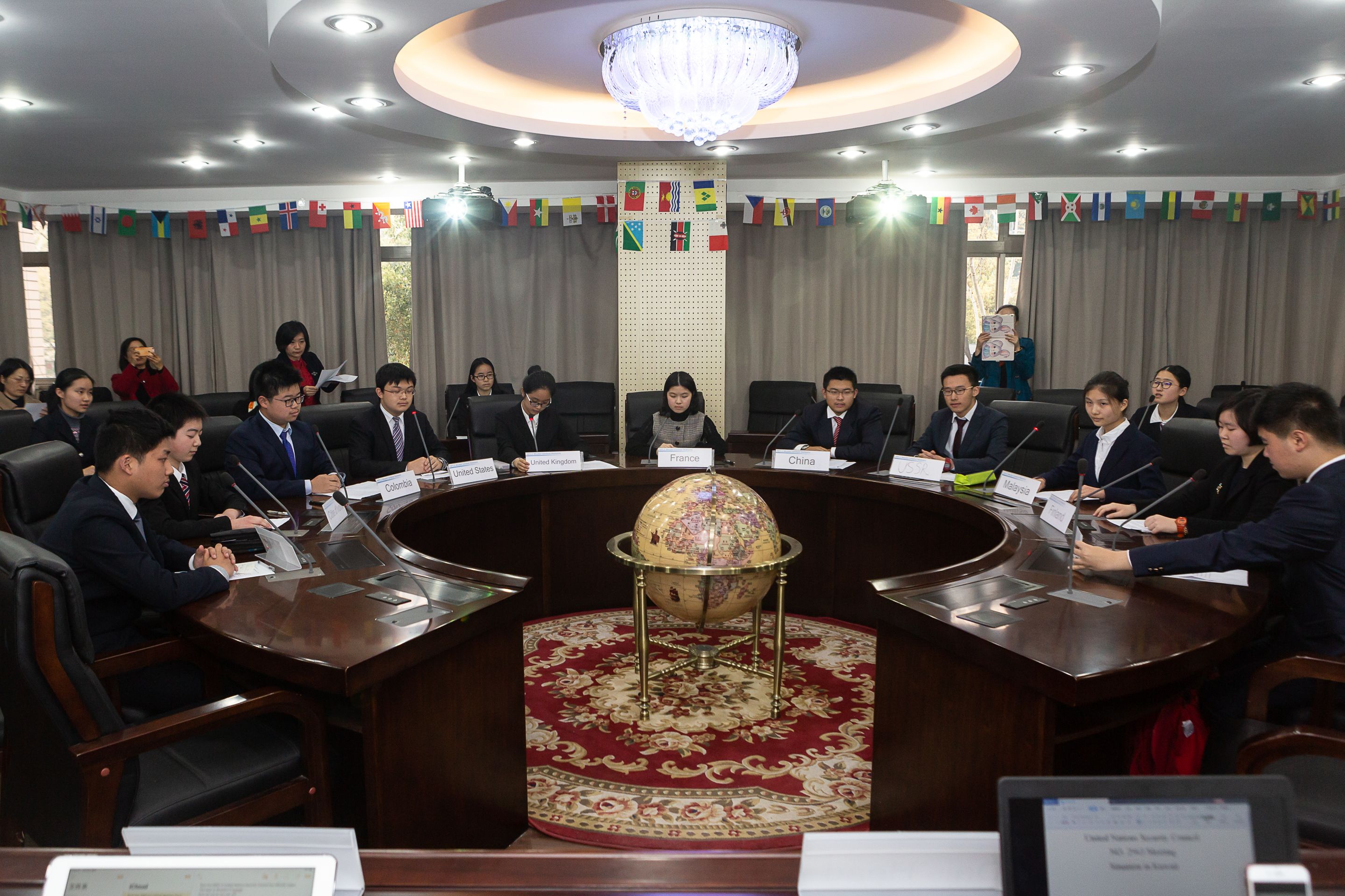 随后,项目组成员参加了“模拟联合国”课程。“模拟联合国”一直是我校历史课程的骄傲,该校学生曾多次参加国内知名大学的模联大会,与大学生们一争高下;他们还参加过美国耶鲁、哈佛、宾大、霍普金斯等国外模联及在欧洲举办的“海牙国际模联会议”,近3年获得“最佳代表9人次”“杰出代表15人次”“最佳外交风采5人次”“最佳代表团奖1次”的佳绩。 这次我校“模联”展示的“国际时刻”是“1990年科威特局势”,即要求伊拉克充分遵守第660(1990)号决议及其后所有有关决议,讨论最后通过授权会员国与科威特政府合作。整个现场生动还原了“History moment”,学生充分展示了深厚的外语表达功底和良好的外交精神风貌,沉稳老练,从容有则。