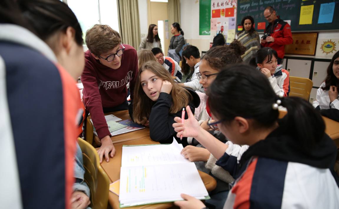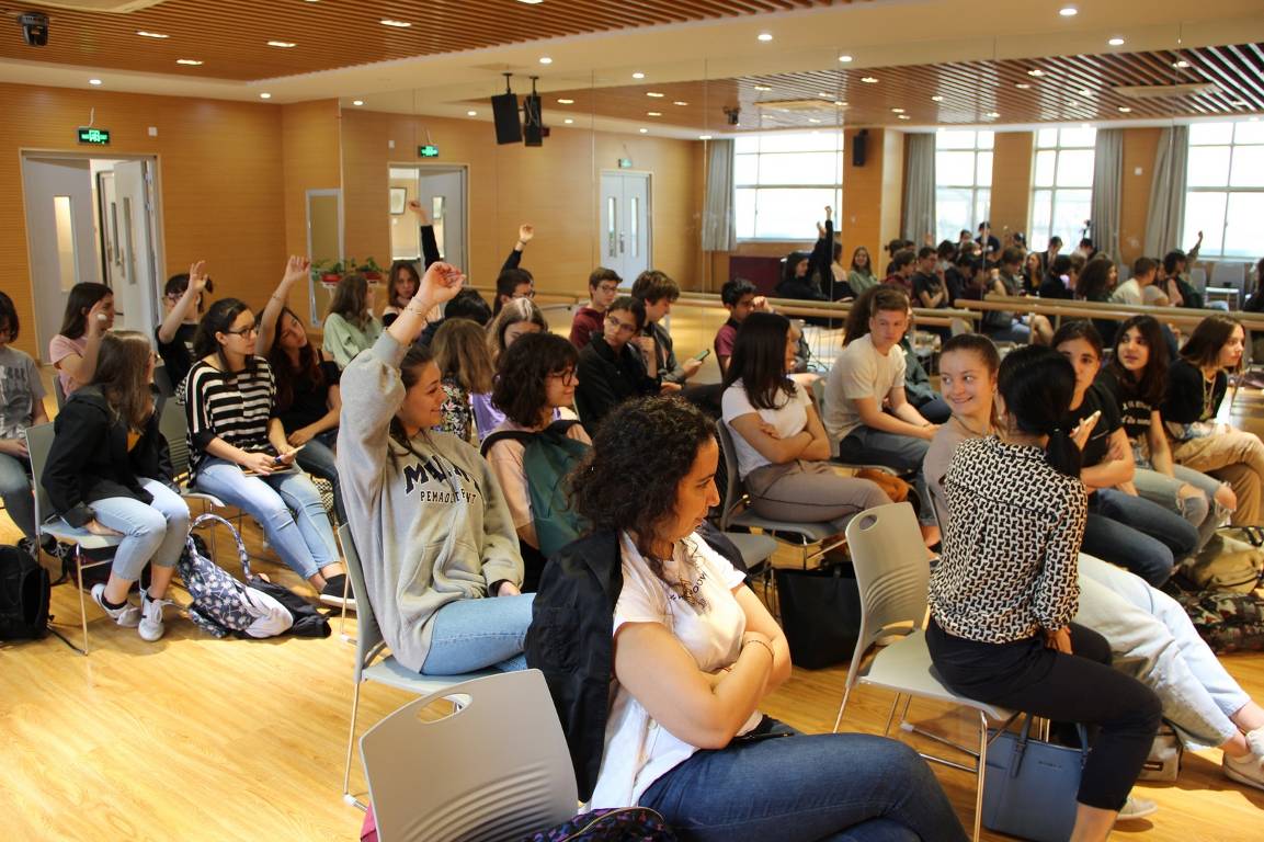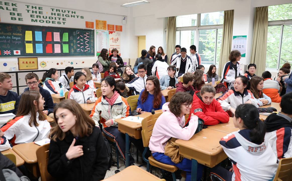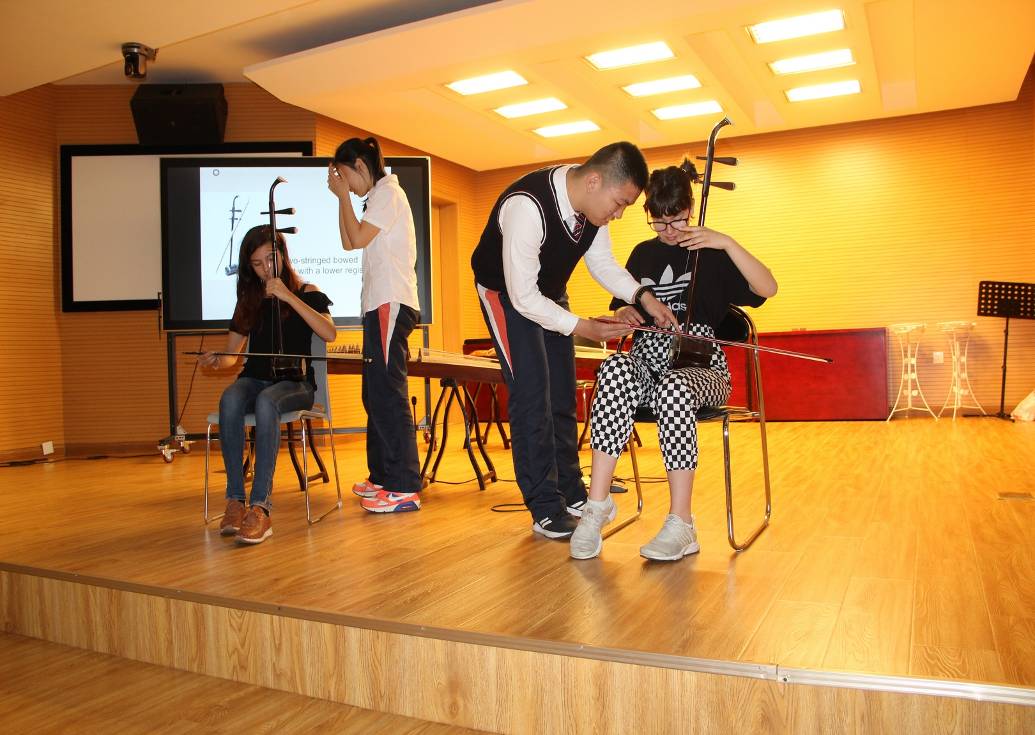4月8日,交流生来到学校上课。民族音乐课上,我校学生为法方学生展示了中国古典乐器二胡、古筝的演奏,并邀请他们亲身参与,发现中国传统音乐之美。法国学生积极踊跃地参加,充分利用这个机会探索中华文化,中法学生文化交流氛围融洽。在音乐课后,法国学生还观看了我校一年一度的外语节汇演,畅游语言世界。