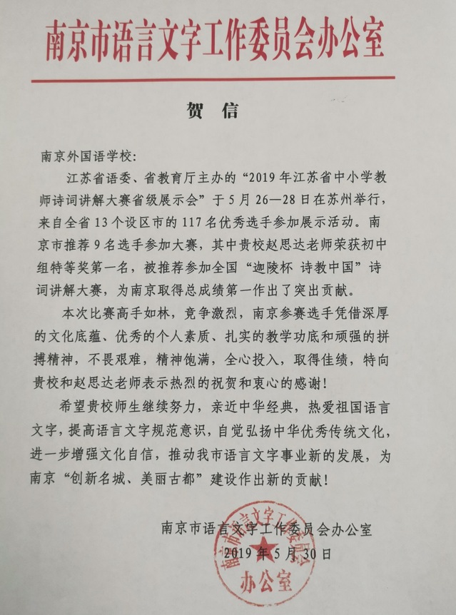 江苏省中小学教师诗词讲解大赛于5月27日在苏州举行。来自江苏各地的选手齐聚一堂,在专家评委面前展示了各自的诗词颂读水平和讲解能力。我校赵思达老师作为南京市初中教师组的选手参加了此次比赛,在全省13个城市的39名选手中得分最高,荣获全省特等奖第一名,显示了我校青年教师的精神面貌和语文教学水平,为南外又夺得一块金牌。