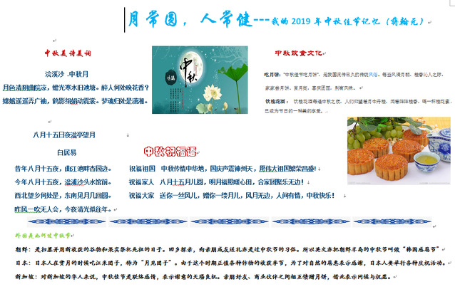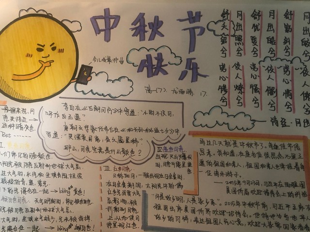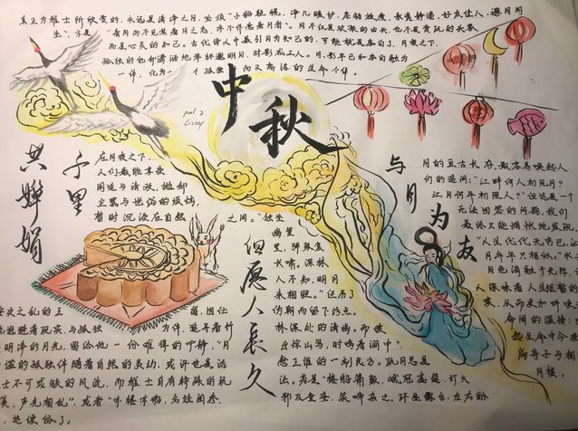 (一)寄情于景,共享团圆。同学们在中秋节与家人一同赏月,并收集有关中秋月景的美文片段和诗词歌赋,交流彼此对于两个传统节日寄托情感的看法,整理制作成中秋节专题小报。小报内容涵盖了传统节日的历史由来、人文风俗。