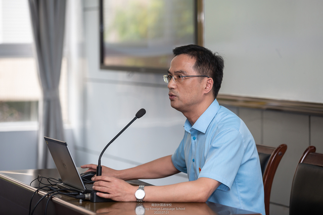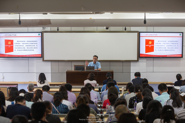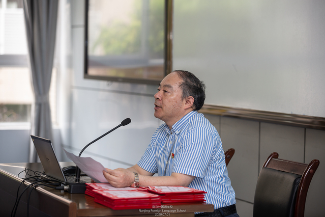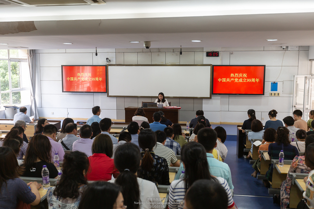 7月1日下午,中共南京外国语学校党委开展专题党日活动,热烈庆祝中国共产党成立99周年。校纪委吕燕书记主持,学校全体党员出席。