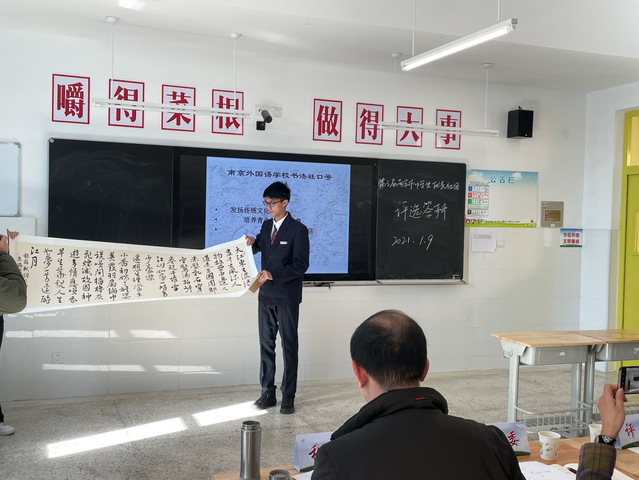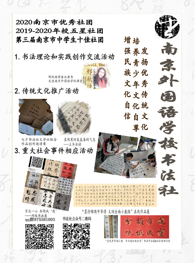 2020年11月份开始,南京市教育局组织开展了第三届南京市中学生社团展示评选活动,经过校内选拔、区级推荐和市级评审,南京外国语学校书法社顺利入围45个获得决赛阶段的现场展评资格的社团。经过社团展示答辩,专家现场评分,南京外国语学校书法社最终获得“南京市十佳中学生社团”(高中组)。