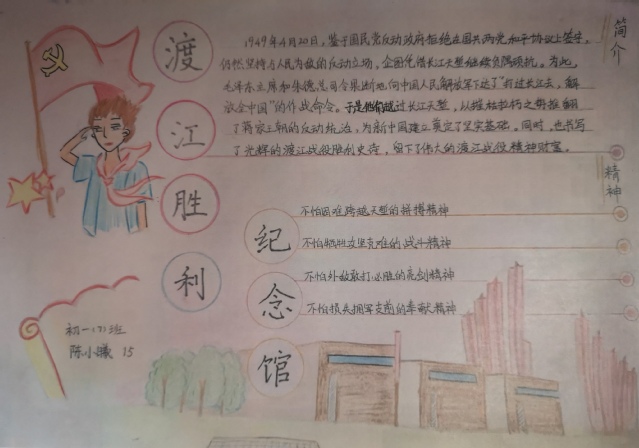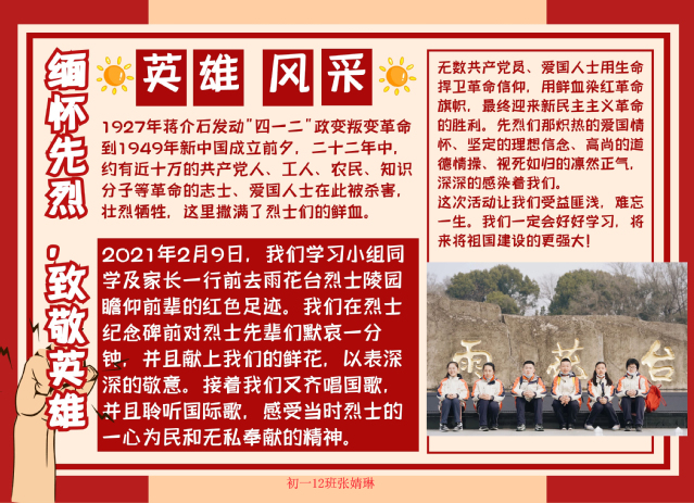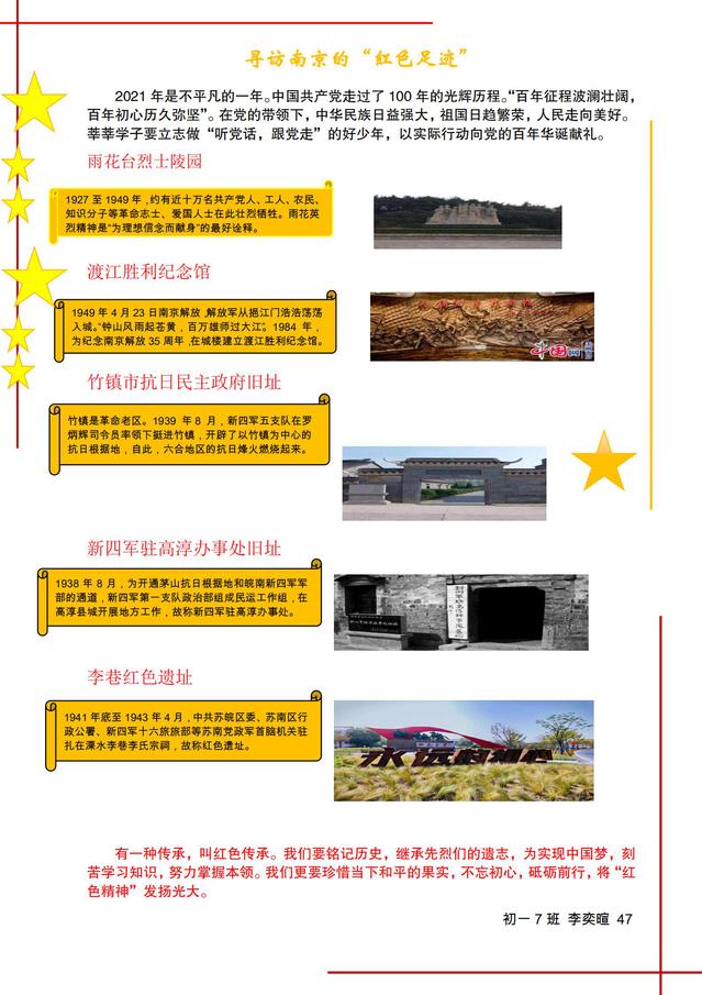 2021年是中国共产党建党100周年,为了庆祝党的百年华诞,2020级初一学子们利用寒假时间寻访南京的“红色足迹”:雨花台烈士陵园、梅园新村、渡江胜利纪念馆……他们走过见证历史的土地,用小报去铭记这次实践带给自己的感动与思考。