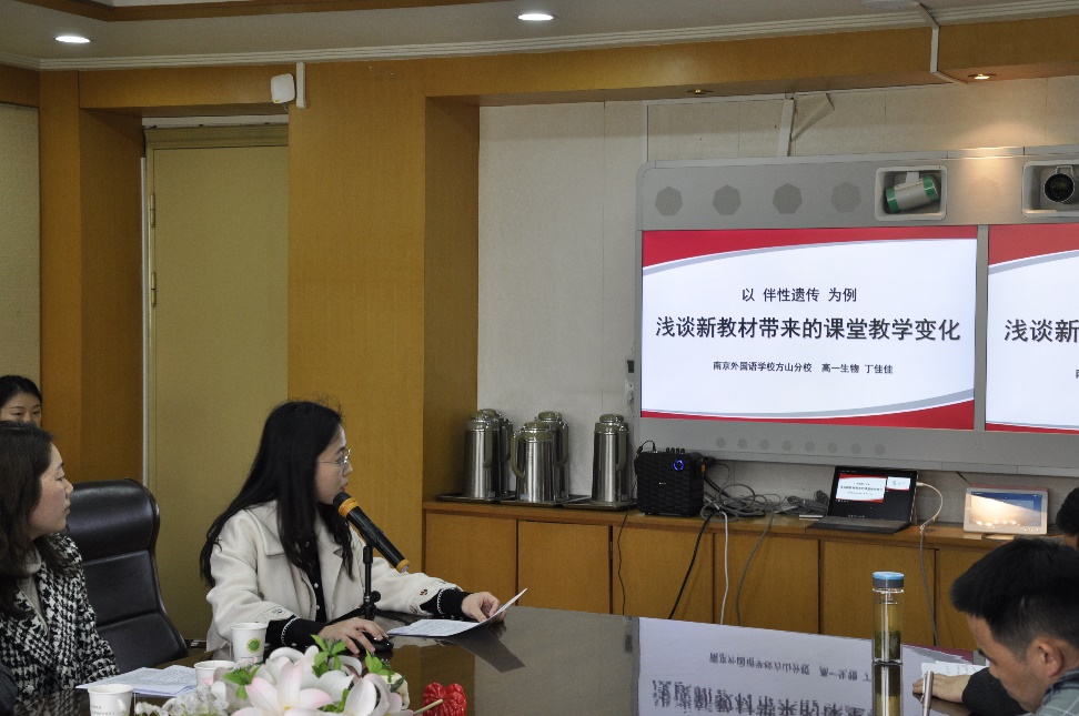 来自南外方山分校的丁佳佳老师以《以伴性遗传为例,浅谈新教材带来的课堂教学变化》,从“发展核心素养,全面育人;新旧教材变化,带来启发;伴性遗传为例,教学变化”进行分享交流。丁老师认为在课堂教学中,可以设计真实情景下的问题驱动、优化课件的插图版面,加强美育。具体到《伴性遗传》这节课,丁老师让学生扮演医生,创设了遗传咨询的情景,根据对家族系谱图的分析,将重要概念转化为几个逻辑连贯、依次递进的小问题引发学生思考。让学生能够应用所学知识分析与生物学有关的现实问题,培养学生的科学思维与社会责任。