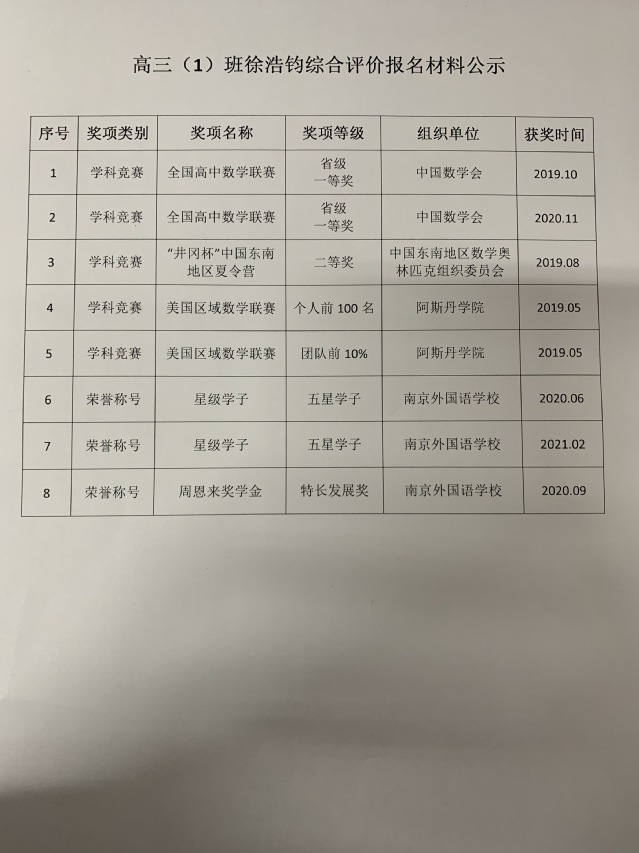 3.经本人申请,现将综合评价获奖情况申报材料公示如下:
