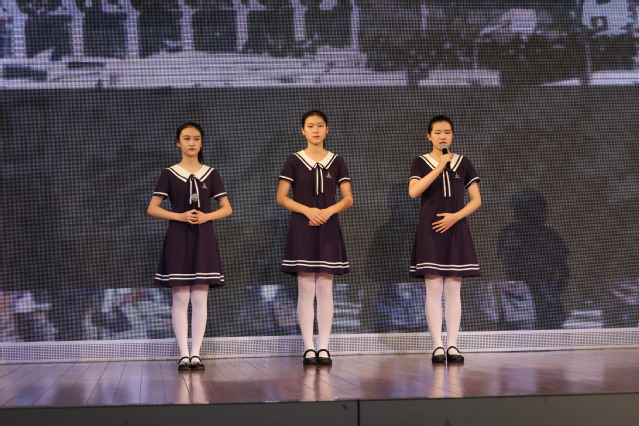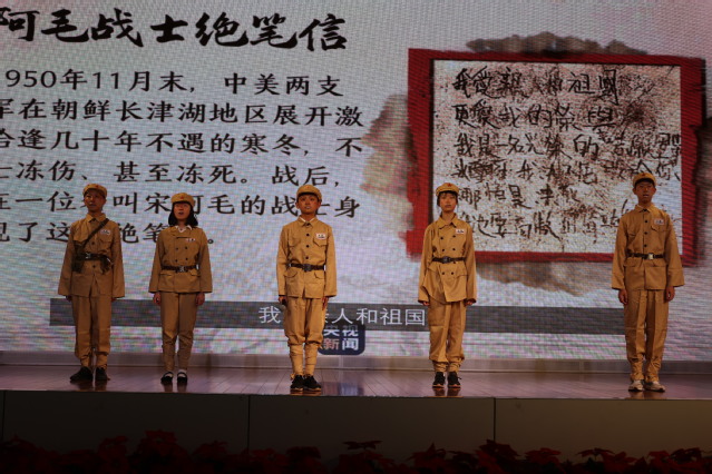 初二2班带来朗诵《鸭绿江畔的呼唤》。赞美英勇的中国人民志愿军不畏艰险,不怕牺牲的革命英雄主义精神。