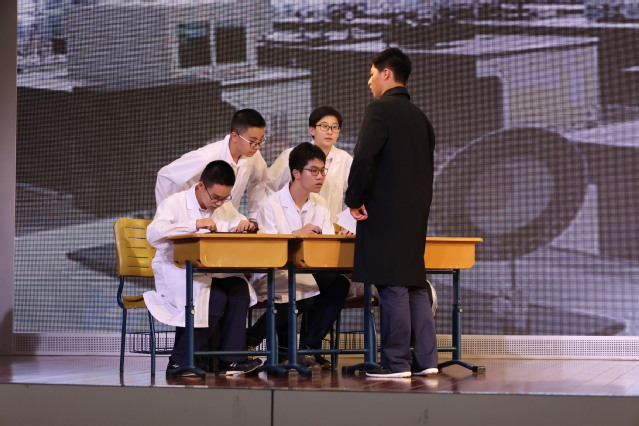初二9班带来话剧《钱学森——归国之路》。钱学森为了祖国的建设,冲破美国的一切阻挠,毅然决然地踏上归国之路,让一颗炽热的导弹划破中国的长空,爆发出震惊世界的巨响。