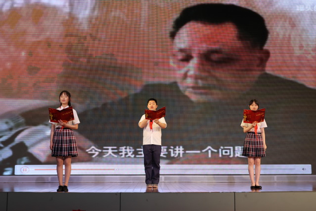 初二1班带来节目《为官一任,造福一方》。焦裕禄凭一己之力撑起了兰考的天,他是党的好干部,是点亮夜空的闪耀之星。