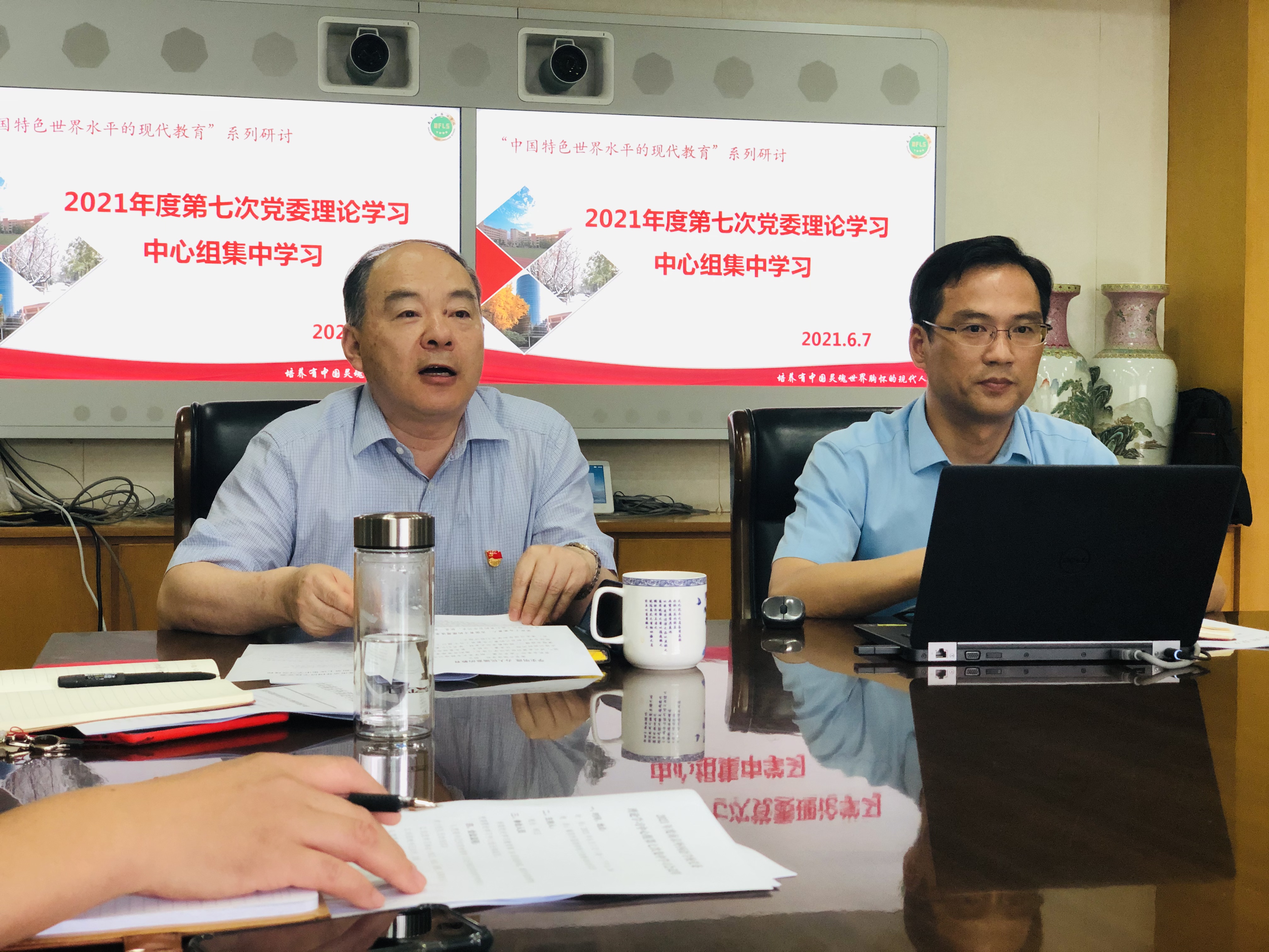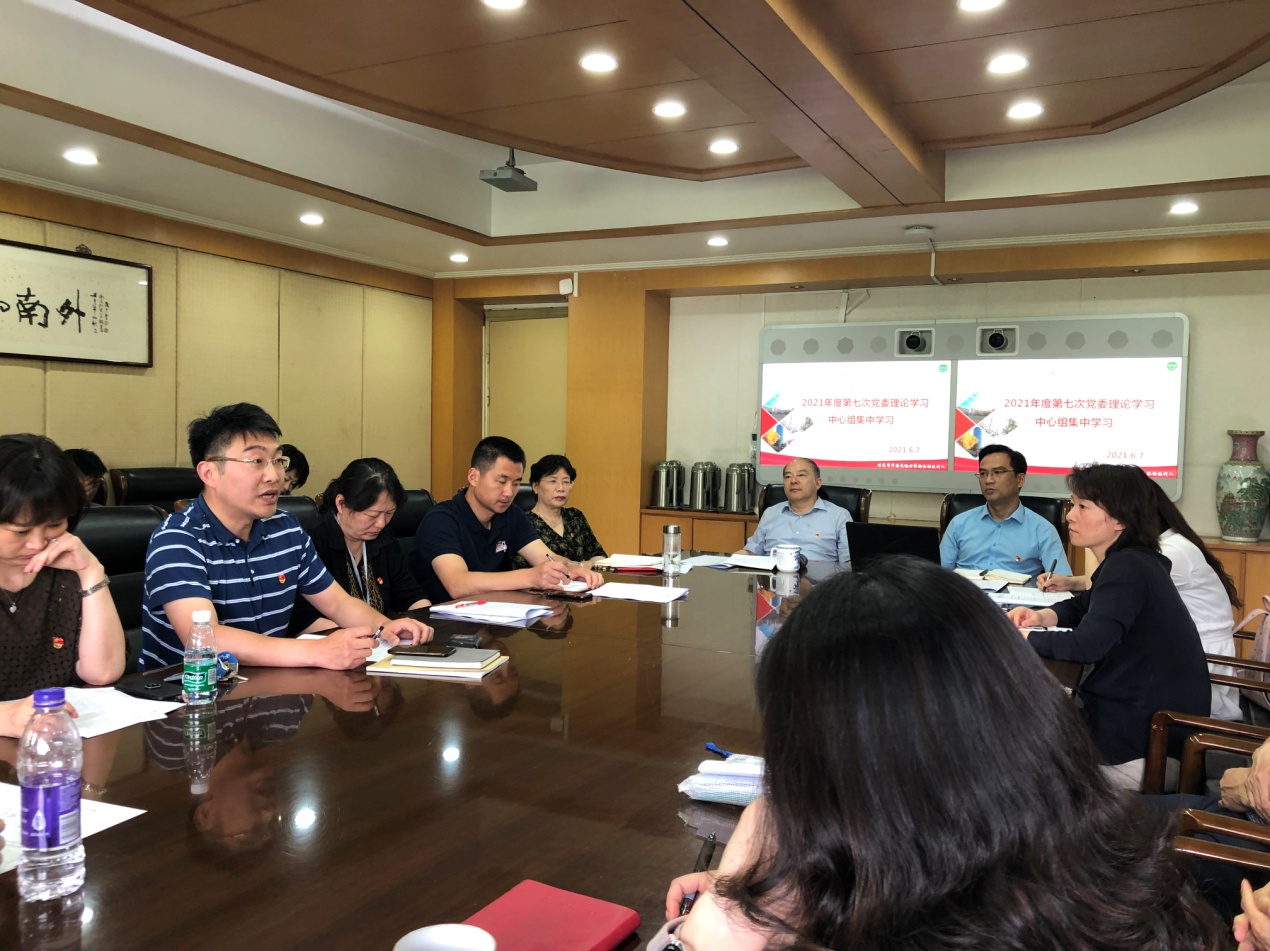 南京外国语学校党委理论学习中心组2021年度第七次集中学习6月7日下午在行政楼410会议室举行。会议由邹正校长主持,中心组全体成员参加,开展党史学习心得交流。市委第十六巡回指导组同志列席旁听。