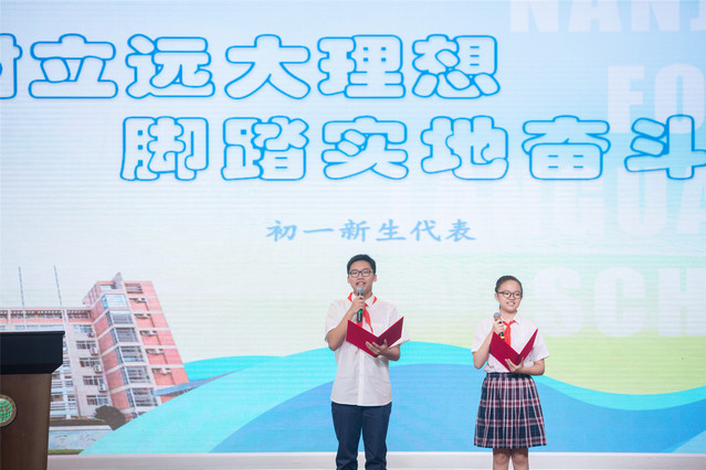 初一9班冯思远和初一12班王希瑞同学作为新生代表做了主题发言“树立远大理想,脚踏实地奋斗”。