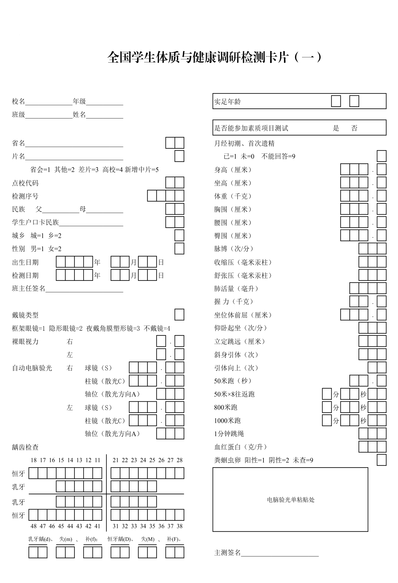 监测样本为体测样本。体测样本由参加健康体检的学生中筛选出的正常学生(正常学生指能进行各项体育锻炼活动,发育健全、身体健康的学生)构成。凡心、肝、脾、肾等主要脏器有病者,身体残缺、畸形者,急性病患者或一月内患过高烧、腹泻等急性病、体力尚未恢复者及处于月经期间的女生均不得参加素质项目的测试。