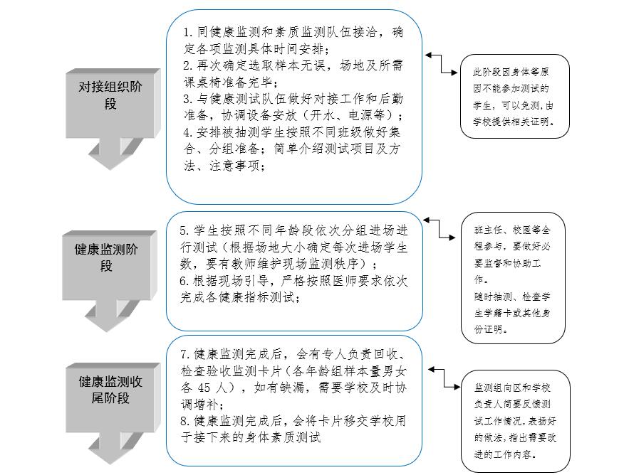 备注 | 1.健康指标监测由南京市中小学卫生保健所负责完成;身体素质监测指标由南京市中小学生体质健康促进研究中心负责完成,并同步进行测试。 2.被测试学校需提前准备好测试专用教室、场地、器材、桌椅、号码背心等。 | |