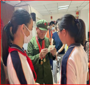 寻访当天,队员们早早来到了世茂滨江社区中心,成诗开爷爷穿着军装,佩戴着勋章来到了我们身边,小组同学首先给成诗开爷爷献上了献花,并将集体签名的感恩卡送给了爷爷。