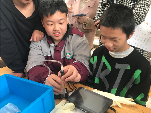 第三个环节是基于数字化实验的科学探究专题课,由工作室成员、南京外国语学校殷晓婕老师执教《空气中氧气含量测定的再探究》,精妙的教学设计,灵动的体验教学,让孩子们化解了一个个教学难点,激发了学生学习化学的兴趣,优化了学生学习化学的思维,彰显了科学探究教学的生命力,也激发了全体观摩教师的研究热情。这也是周岗学校的孩子们第一次用LabQuest设备做定量探究实验。