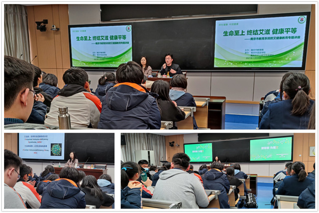 (3)在高中开展“防艾校园行——健康教育专题讲座”。在南京市教育局、南京市中小学卫生保健所的支持下,邀请了南京市疾控中心金牌讲师李昕医生,给高一年级的同学们进行防艾公益讲座。讲座中,李医生通过生动的事例、有趣的视频,向同学们宣传了“要想爱 先懂‘艾’”的主题。