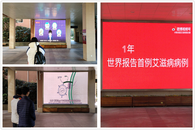 (1)利用学校电子屏播放健康宣教短片,内容包含联合国艾滋病规划署的世界艾滋病日宣传短片、新京报联合腾讯视频制作的《艾滋病背后的“恐艾症”》、央视新闻科普《关于艾滋病的那些事儿》等4个视频。通过视频联播的方式,引导学生对艾滋病的来源和疾病的发展有一个正确的认知。