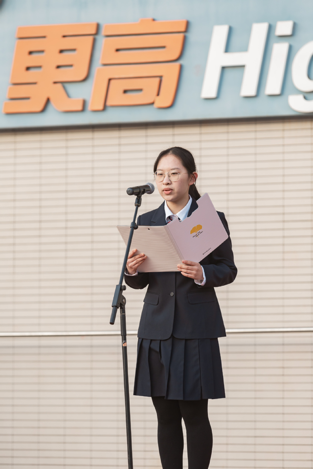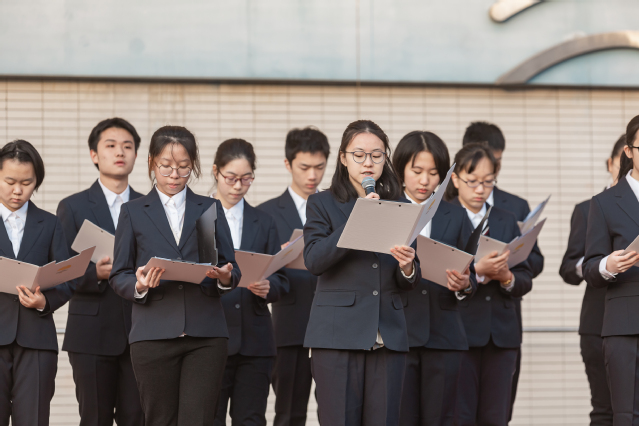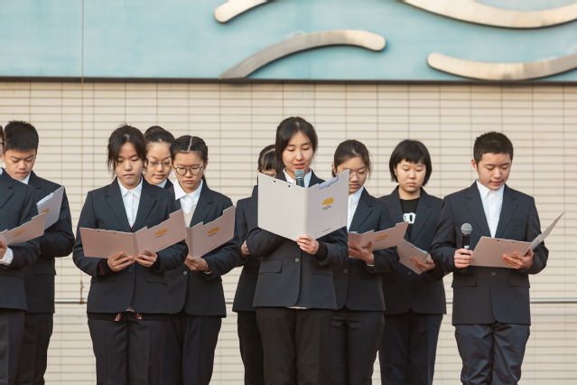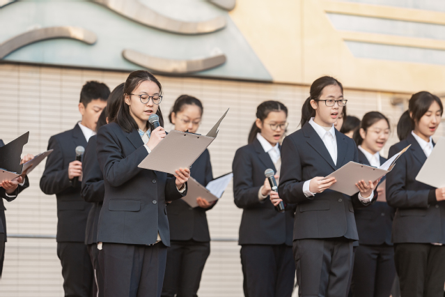 撞钟人由南京大屠杀幸存者后代、志愿者、教师、学生等共12名南京各界代表组成,其中包括我校行前一课师生代表周媛媛老师和谭茗宸同学。下面有请高二四班的谭茗宸同学发言。