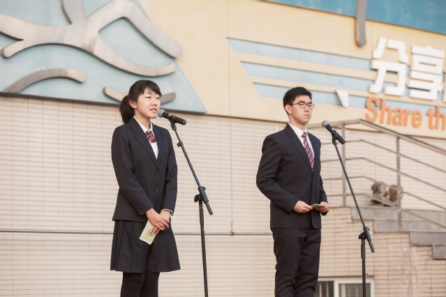 老师们,同学们,大家早上好。我是高二(4)班詹子悦。我是高二(7)班严政皓。今年的9月3日是中国人民抗日战争暨世界反法西斯战争胜利76周年纪念日在南京,侵华日军南京大屠杀遇难同胞纪念馆举行了特殊的撞钟仪式,以此警示世人不忘过去、珍爱和平。
