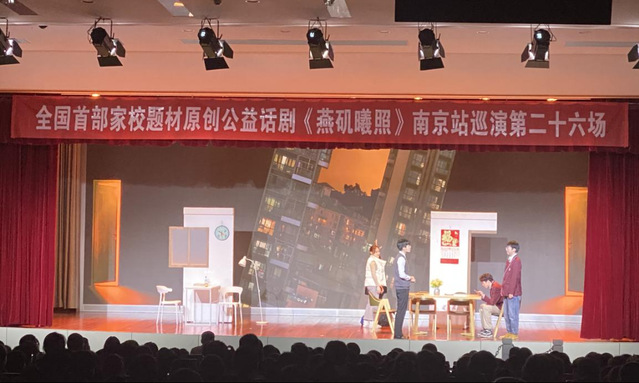 2021年12月13日下午,国内首部家校题材原创公益话剧《燕矶曦照》在我校举行第二十六场南京站巡演,初一年级全体师生共同在报告厅观看了此次话剧演出。