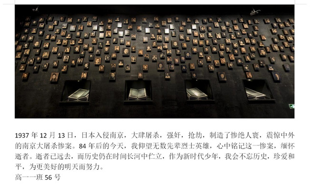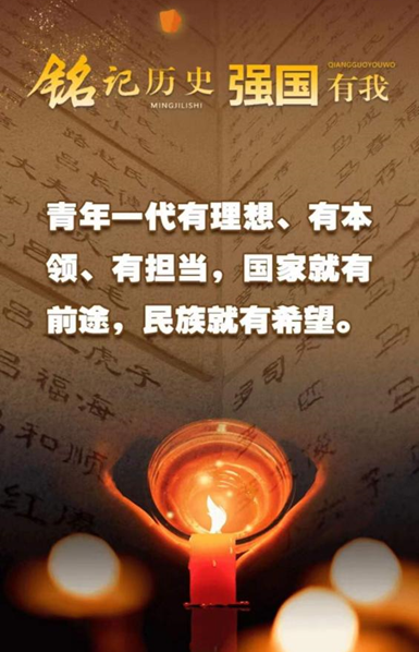 习近平总书记说过:“忘记历史就意味着背叛,否认罪责就意味着重犯”。每年的国家公祭日我们举行公祭仪式,撞响和平大钟,拉响防控警报,我们青年学子要铭记那段惨痛历史,珍惜今天的幸福生活,不负时代,不负韶华,不负党和人民对我们的殷切期望,为实现中华民族伟大复兴贡献聪明才智!