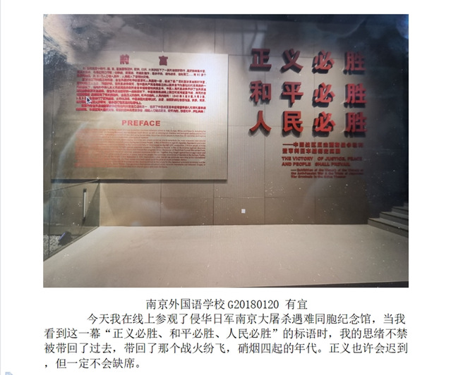 202112月13日是新中国成立后的第八个国家公祭日。校团委组织高一各支部开展“铭记历史,强国有我”国家公祭日系列主题教育活动,活动内容有:学习宣传贯彻党的十九届六中全会精神主题团课线上参观“侵华日军南京大屠杀遇难同胞纪念馆”“铭记历史,强国有我”主题征文。全体高一团支部按要求开展各种形式的活动,引导南外学子牢记历史、珍爱和平、开创未来。