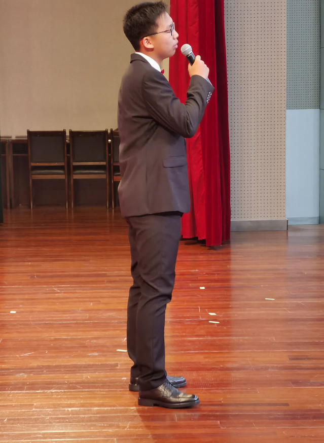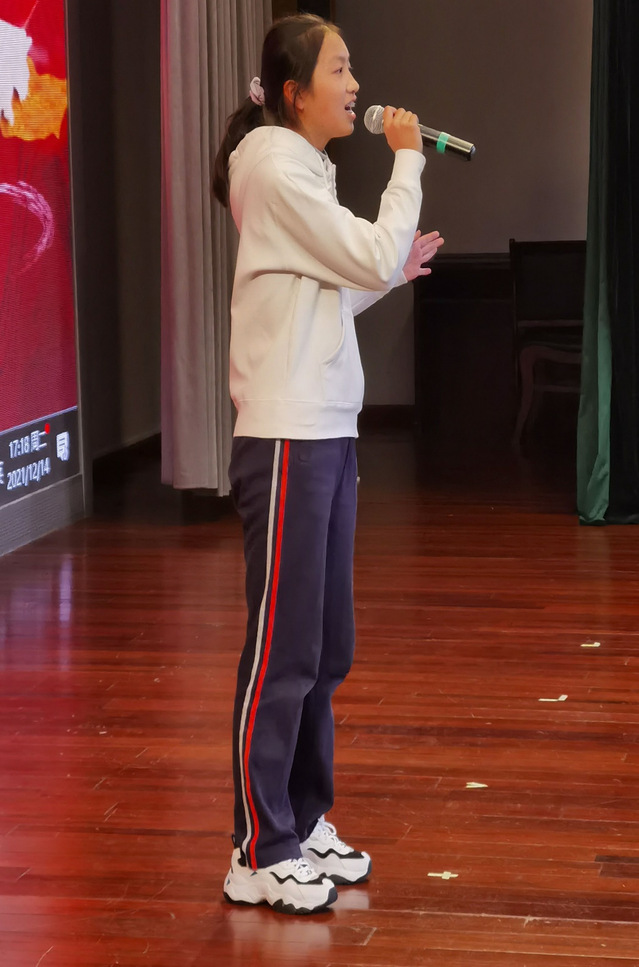 西装革履,英姿飒爽。一首《不忘初心》,将爱国情怀表现得淋漓尽致。老师对他赞赏有佳。
