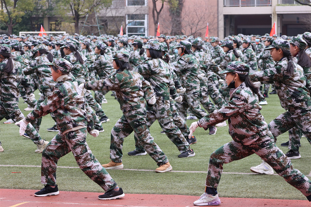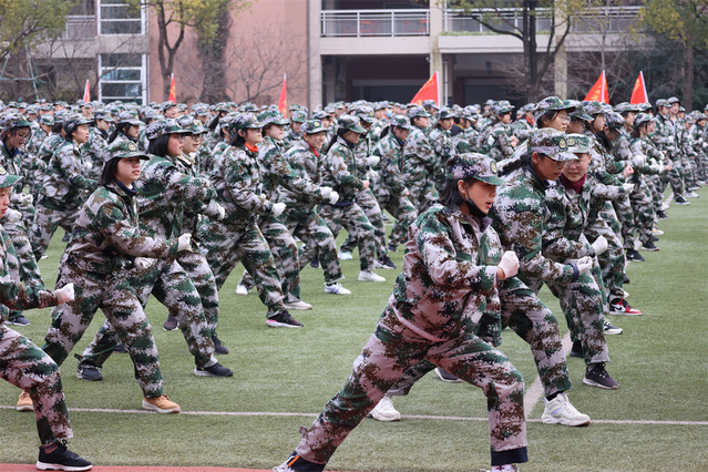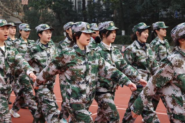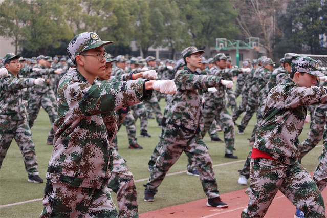 同学们首先分男女练习了擒敌拳和军体拳。在将水杯整齐放好在队伍前列后,大家便在教官的指导下学习了剩下的动作,并且复习了前面学过的动作。天高云淡,蓝天白云下回荡着同学们响亮的口号声和气势磅礴的脚步声,这一声声“哈”“大”“嘿”中,洋溢的是同学们十足的激情与信心。教官在一次次呐喊中嘶哑了的声音,更坚定了我们要努力学好的决心。