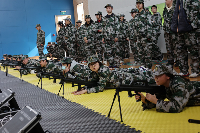 早上我们还进行了电子打靶。在教官演示过如何在地上趴好和如何握枪后,同学们兴高采烈地开始了自己的尝试。在教官和小朱老师的指挥下,同学们分成了一排排,井然有序地趴下拿枪。“砰砰”的响声不绝于耳,同学们脸上兴奋的笑容清晰可见,眉眼弯弯、嘴角上扬,这是同学们在互相交流打靶成绩时的表现。
