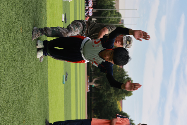 拿枪、上膛、俯卧位持枪、直腿卧姿持枪…战术班的同学们不顾滚烫的草坪,严格按照教官的指令完成动作。他们按照实战化标准真摔真打,如猛虎下山蛟龙出海。四天的训练结束后,他们的手掌起了茧子,肘部被磨出了血丝。