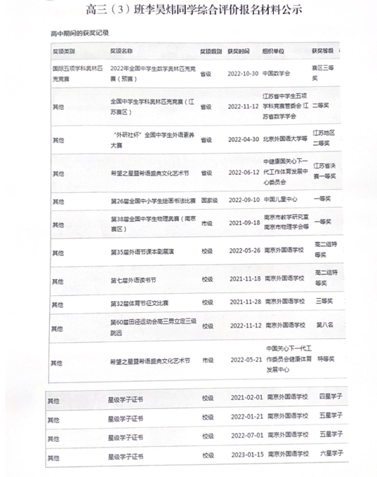 3.经本人申请,现将综合评价获奖情况申报材料公示如下: