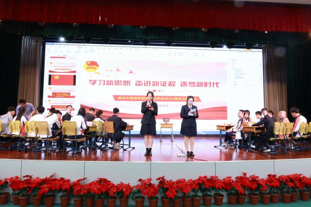 2023年5月4日下午,南京外国语学校纪念五四运动104周年、暨高中“五四”辩论赛决赛、“习近平新时代中国特色社会主义思想暨党的二十大精神”知识竞赛活动于报告厅拉开帷幕,高一、高二全体同学参与了活动。本次活动主题为“学习新思想,奋进新征程,逐梦新时代”,旨在让同学们学习先进思想,坚定前进信心,重温五四精神,树立远大理想,充分领悟新时代青年的责任与担当。