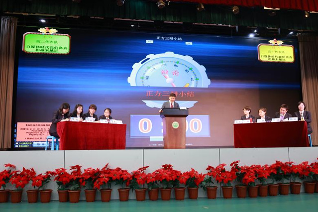 第二部分为高中“五四”辩论赛决赛。此次辩论赛意在引导同学们结合新时代的背景和特征,探讨自媒体时代,人们与真相的距离,以此激发大家的批判性精神,正确对待良莠不齐的信息。正方的观点是:自媒体时代我们离真相越来越近;反方的观点是:自媒体时代我们离真相越来越远。比赛的3位评委分别为南京大学新闻传播学院胡翼青教授、南京外国语学校南部新城综合管理办公室主任尹荷蓉老师、初一年级组长戴霞老师。正方四位辩手分别为高二(2)班刘若卉、高二(1)班邵舒婷、高二(7)班张佳宁、高二(4)班钟可涵,反方四位辩手分别为高一(6)班孟佳琪、高一(10)班姚亦辰、高一(10)班俞越、高一(4)班吉书瑶。通过激烈的思维碰撞和精彩的交锋质询,反方代表队在此次辩论中更胜一筹,正方张佳宁同学、反方姚亦辰同学凭借突出表现荣获“最佳辩手”称号。胡教授对辩论赛做了精彩点评,他肯定了同学们的精彩表现,也指出面对信息时代多样的媒体渠道,同学们要冷静思考,理性判断,对信息做到求真求实。
