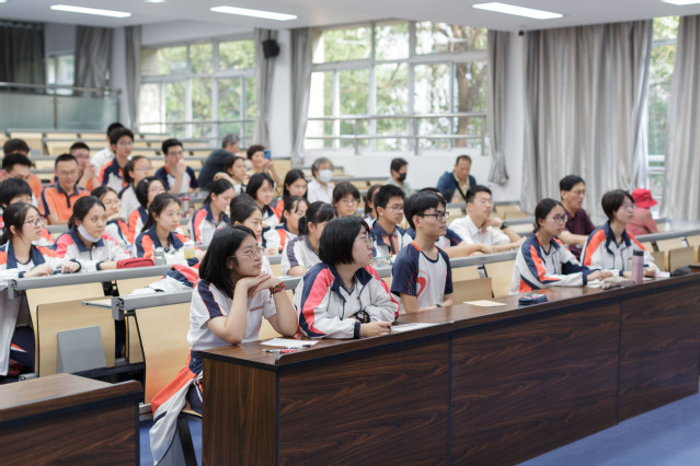 青年才俊、高二语文组姚树义老师主持大会,纪委书记吕燕老师陪同儒雅大气的钟教授来到现场,大家以热烈的掌声欢迎老校友的莅临指导。