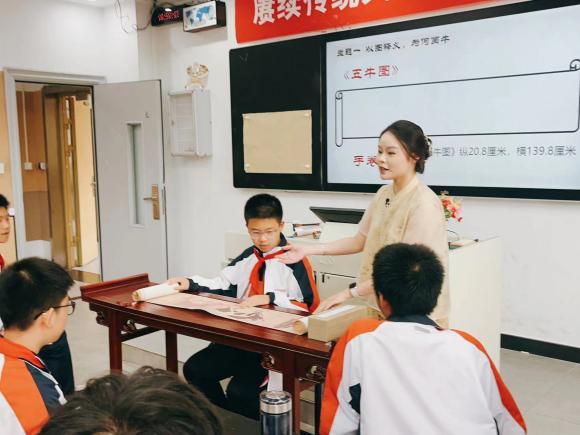 活动伊始,南京外国语学校教师王茜怡带来了一节名为《“神气磊落,稀世名笔”——五牛图》的公开课。王茜怡老师将核心素养融入教学目标,以“周总理收到的一封神秘来信”创设课堂教学情境,整堂课分为“以图释义,为何画牛”、“以线造型,如何画牛”、“以心摩古,我来画牛”三个层层递进的活动主题,与同学们一起探索《五牛图》的历史与艺术价值,体味中国画线条的笔墨意趣。