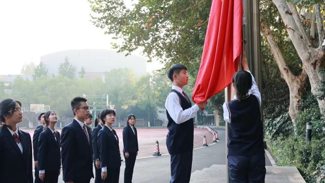 今年秋季,我们从上一届国旗班手中接过守护国旗的重任。那天,我站在旗杆下,激动的心情溢满胸腔。我看到,那如初升朝阳般红艳的五星红旗伴着国歌缓缓升起——这一抹红,直直映入我的心底,化作力量、信念与希望。从此,在每周一的清晨,我有幸守护在这抹中国红的身边,看着她迎着霞光,展向蓝天。