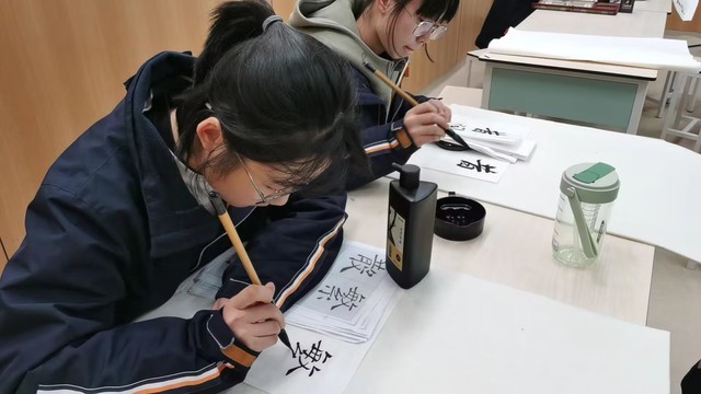 比赛开始后,同学们提起笔来,屏息凝神,调整自己的状态。教室瞬间变得安静下来,似乎被纸墨的味道浸染了。过了不久,大家陆续开始下笔,行云流水,笔酣墨畅。我们可以看到笔画方圆的隶书、飘逸优美的行书以及豪放潇洒的草书。时间一分一秒地过去,同学们的笔触越来越快,宣纸上也出现了一幅幅精美的作品,有的字如行云流水,有的字如山水画般婉转动人,让人叹为观止。