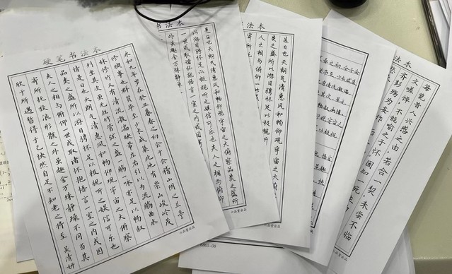 硬笔书法的同学也有着极为精彩的表现。硬笔书法的比赛内容为《兰亭集序》片段,大家认真地设计构思、布局、打草稿,准备好后,同学们开始书写这优美浩然的千古诗篇。挥毫落纸如云烟,或苍劲,或婉转;流畅肆意,却又有章可循,在一横一竖一撇一捺中,呈现的不仅是有形之字,更是汉字之美。