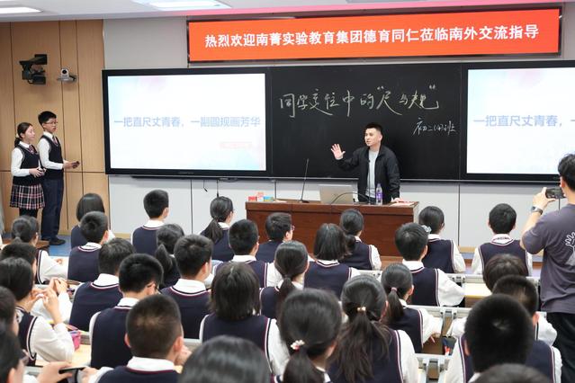 分享结束后,初二(4)班同学和班主任陶维维老师带来了一节班会课展示。班会课主题为“同学交往中的‘尺与规’”,围绕男女生日常交往、预防校园欺凌等话题,通过情景剧演示、现场交流分享、游戏互动、师长讲解这几个环节,让同学们明白了日常交往中的度。整个课堂充满积极、轻松、欢乐的氛围,赢得了现场老师的赞许。陶老师也在展示结束后分享了这节班会课的构思与他自己的经验。