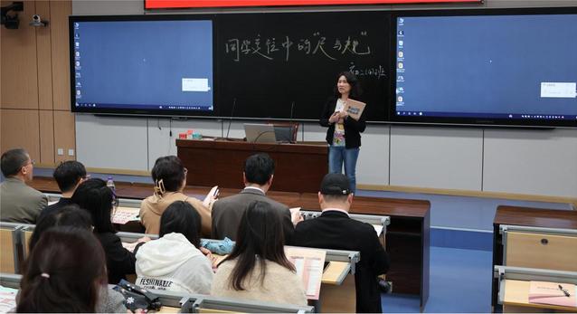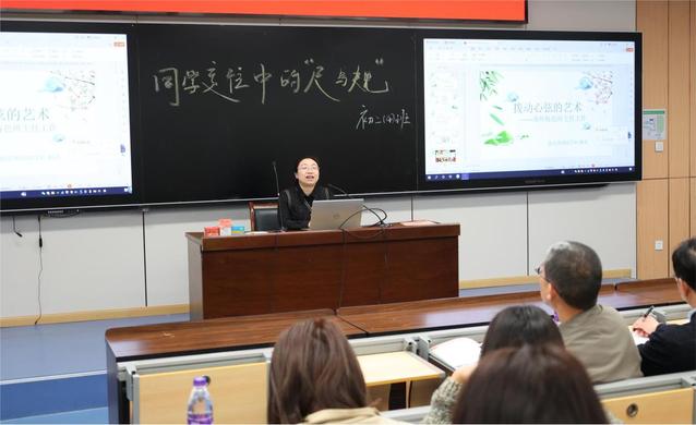 随后顾青老师分享了自己的德育工作经验,围绕“拨动心弦的艺术”这一主题,从发现自己、发现学生、发现方法、发现艺术四个方面展开,全方位向南菁实验教育集团的老师们展现了南外特色班主任工作的亮点。