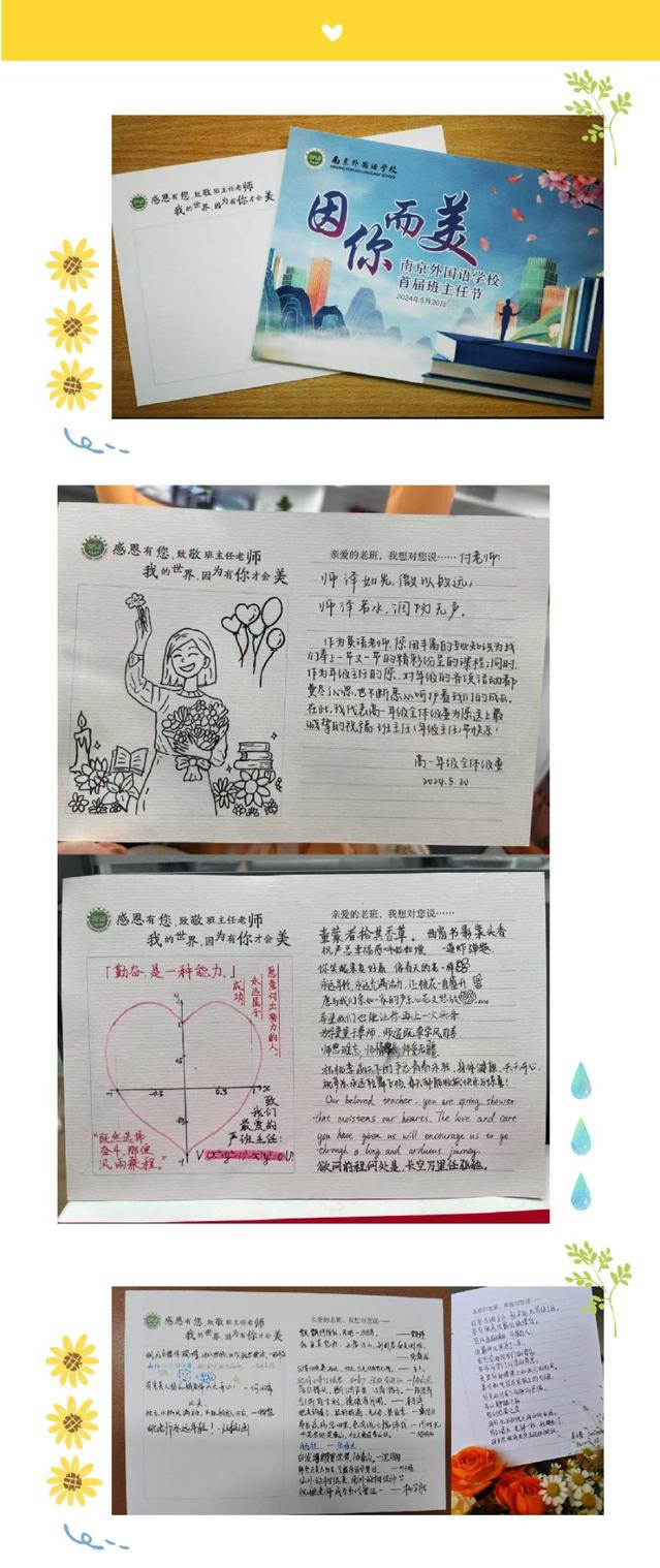 在南外,有这样一群人:他们在班里班外忙前忙后,不辞辛苦,尽职尽责;他们关心同学的点点滴滴,从学习到生活,无微不至;他们不畏风霜,提灯引路,以匠心践行初心,探索立德树人的有效路径;他们俯首耕耘,育梦成光,在坚守中不凡,书写着德育的绚烂华章。他们,就是可敬可爱的班主任们。为表彰班主任的辛勤付出和无私奉献精神,增强班主任队伍的凝聚力和向心力,进一步营造尊师重教的校园氛围,促进班主任专业发展,5月20日-24日,南京外国语学校举办“因你而美” 首届班主任节。