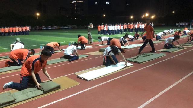 内务方阵的同学们正练习叠被子,随着教官的一声令下,散乱的被子被同学们的巧手叠得规规整整,与传说中的“豆腐块”一般无二。
