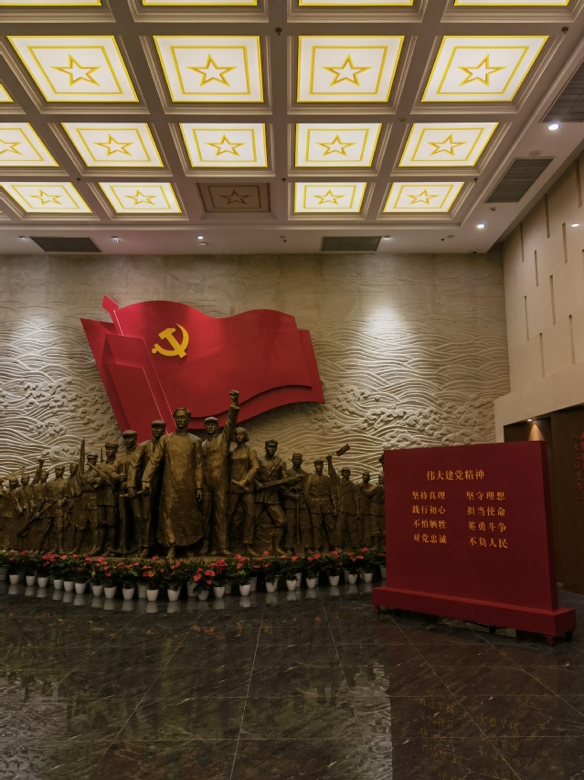 广场的主体建筑是一座巍峨的红色五角星塔,象征着中国共产党的光辉历程。